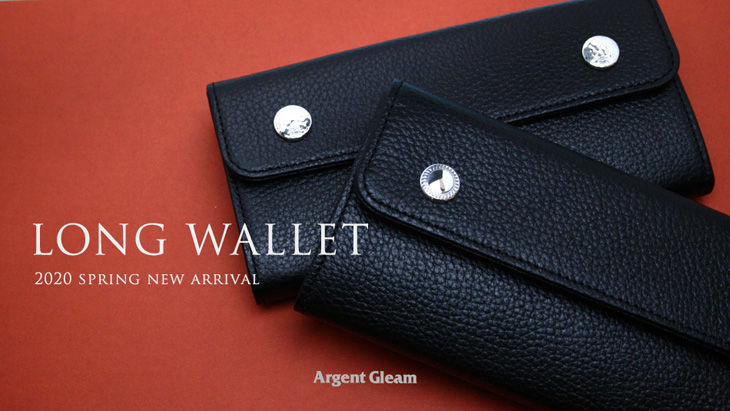 ArgentGleamより2020 NEW LONG WALLETをリリース。 表革に目の細かい上品なシボ柄が特徴のカウレザーでシルバーボタンとの相性を最大限に引き出すため革のフィニッシュにこだわり程よい半艶のマットブラックに仕立て上げられたウォレットは、革端を切りっぱなしではなく折り返してから縫い合わせる「ヘリ返し合わせ」の技法により見た目の高級感とともに耐久性に優れ、内装には最大16枚収納可能なカード棚を設けるなど機能面にも優れたロングウォレットです。 新たに追加されたロングウォレットは、表面に手彫りで凹凸をつけた陰影が美しいシンプルなラウンドボタンをセットしたモデルと太陽をイメージに、アージェントグリームらしい世界観でデザインされたラウンドボタンの2型。 どちらもシンプルで飽きのこない雰囲気のあるウォレットです。